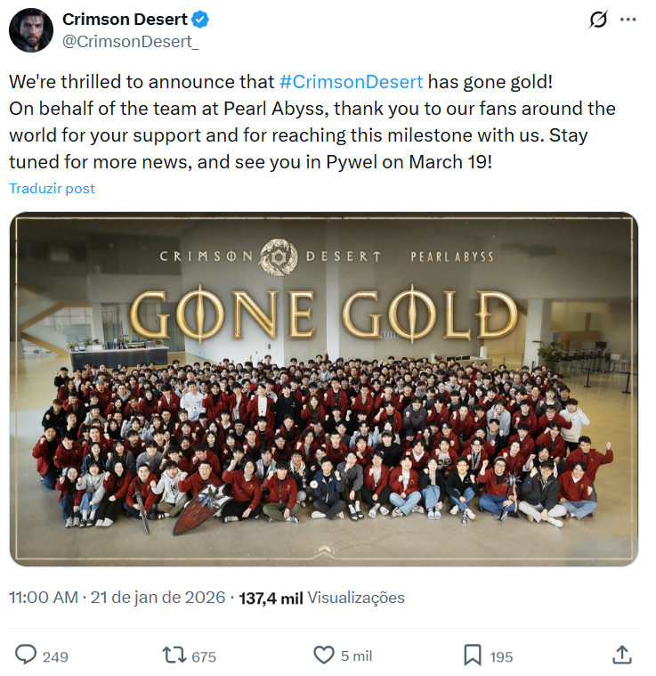 Com o jogo em estado Gold, o sentimento geral é de alívio misturado com empolgação. Crimson Desert finalmente parece pronto para sair das apresentações e cair nas mãos dos jogadores. A conta oficial de Crimson Desert até agradeceu os fãs pelo apoio ao longo da jornada até o gold. Agora o foco é aproveitar o tempo que resta até março para preparar streaming, playlist e o setup para ser um dos primeiros a explorar esse mundo quando ele finalmente estiver nas suas mãos.