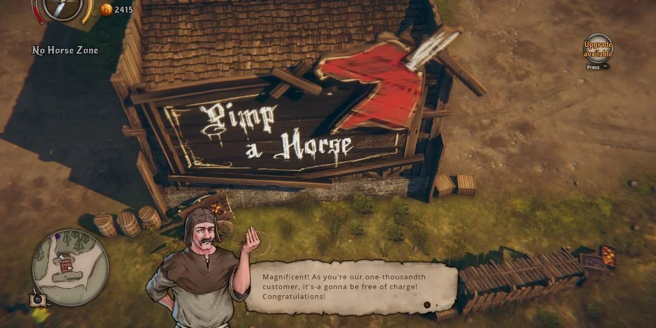 A jogabilidade é um deleite de loucura que faz a gente rir até a barriga doer com tanta referência pop escondida nos cantos mais sujos do reino. É uma sinfonia de destruição onde você pode participar de torneios de luta na gaiola nada honestos ou simplesmente sair por aí roubando carroças como se fossem Ferraris de madeira. A ironia corre solta nos diálogos afiados e o mundo de Rustler parece um espelho quebrado da nossa realidade, onde as faixas de pedestre são pintadas no barro e a lei é algo que a gente deixa guardado no fundo do baú pra poder viver a vida adoidado. É o tipo de experiência que não se leva a sério nem por um segundo, transformando a tela do seu PC num palco de comédia pastelão onde o perigo espreita atrás de cada armadura brilhante.