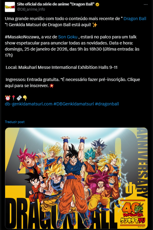 Esse novo capítulo vem em um momento simbólico. Dragon Ball completa quatro décadas de pura pancadaria, emoções e gritos de poder que atravessaram gerações. O Genkidamatsuri vai ser tipo uma carta de amor ao legado de Goku e companhia, com direito a apresentações musicais, painéis especiais e a presença de Masako Nozawa, a voz lendária do próprio Goku. E no meio de toda essa energia, o palco principal vai ser o centro das atenções, com a tão esperada revelação do novo jogo.